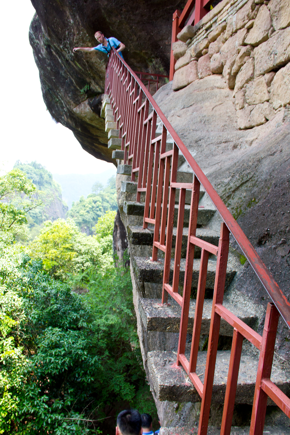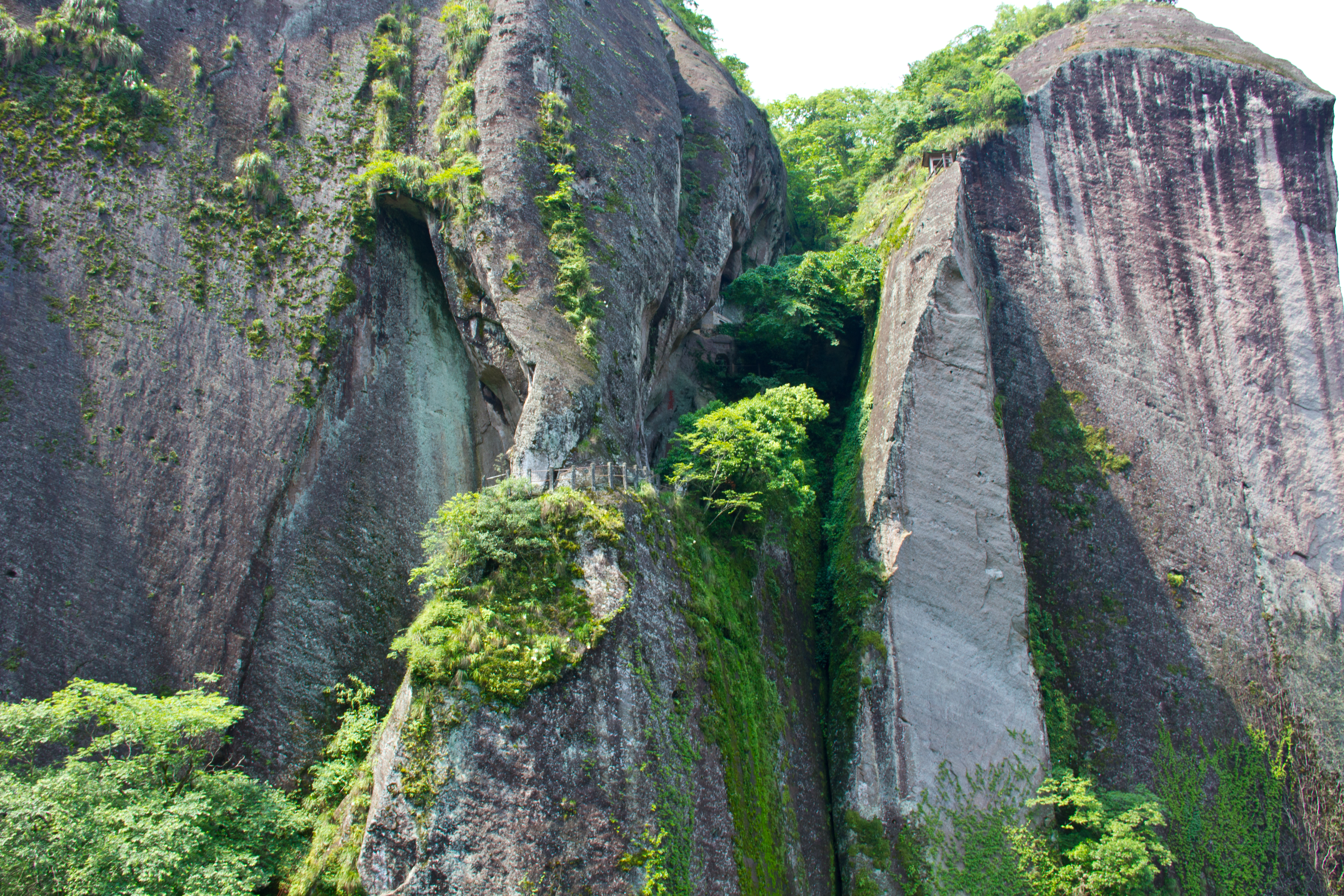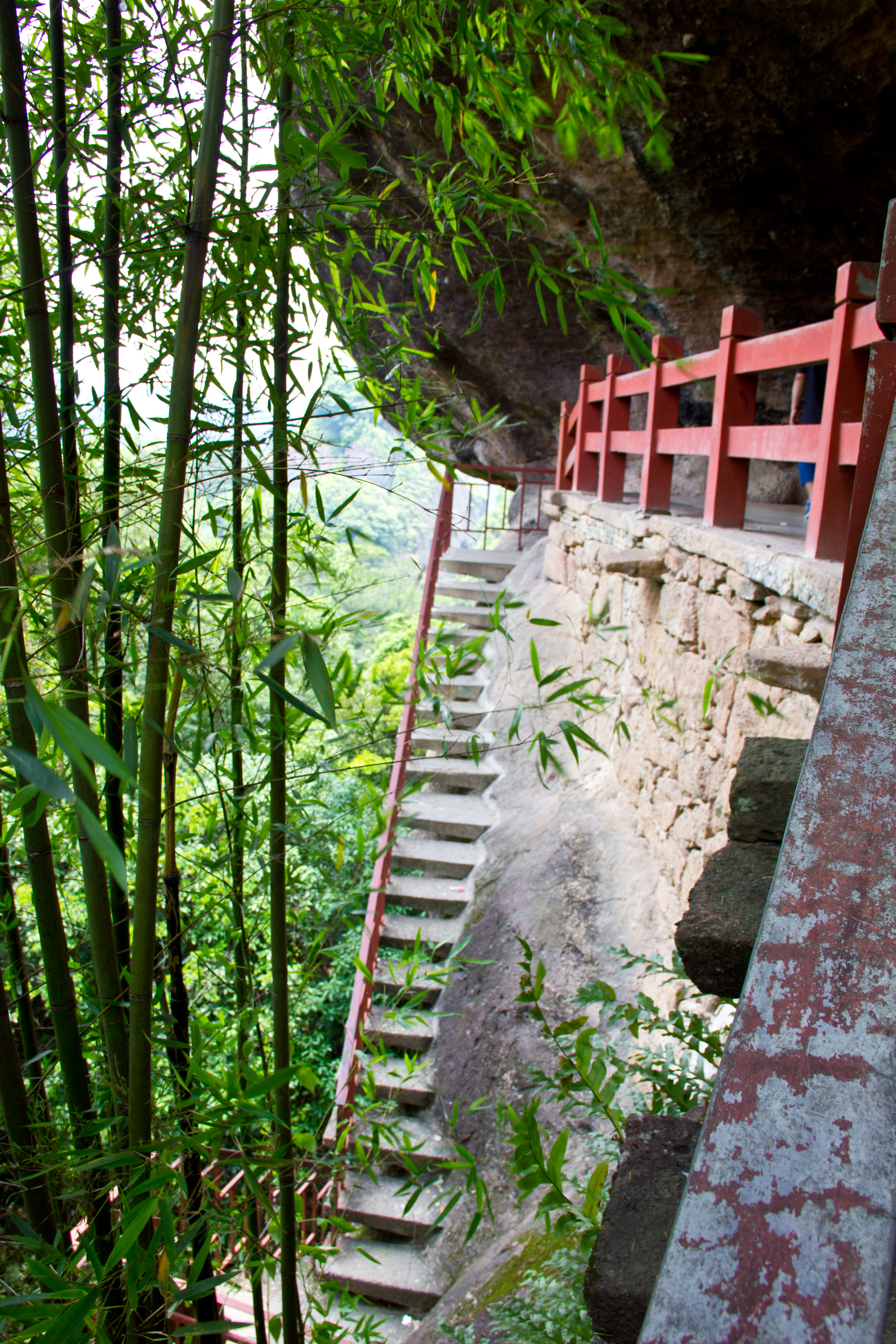 White Cloud Cliff is one of the thirty-six peaks of Wuyi Mountain, also known by its other name Lingfeng (Chinese: 灵峰, pinyin: Líng fēng). It is located in the northwest of the Jiuqu River Valley (Chinese: 九曲, pinyin: Jiǔ qū). At the top is the Baiyun Temple (Chinese: 白云禅寺, pinyin: Báiyún chánsì). It looks like a hanging temple and can be accessed via a bridge. The temple was built during the Ming Dynasty and burned down several times, rebuilt and completed in 1994. The temple was located along a long, narrow cliff. Here you can also see the ruins of old temples, a cave, the Lu Donglai Reading Room (Chinese: 吕东莱, pinyin: Lǚ dōng lái) and inscriptions on the rocks.