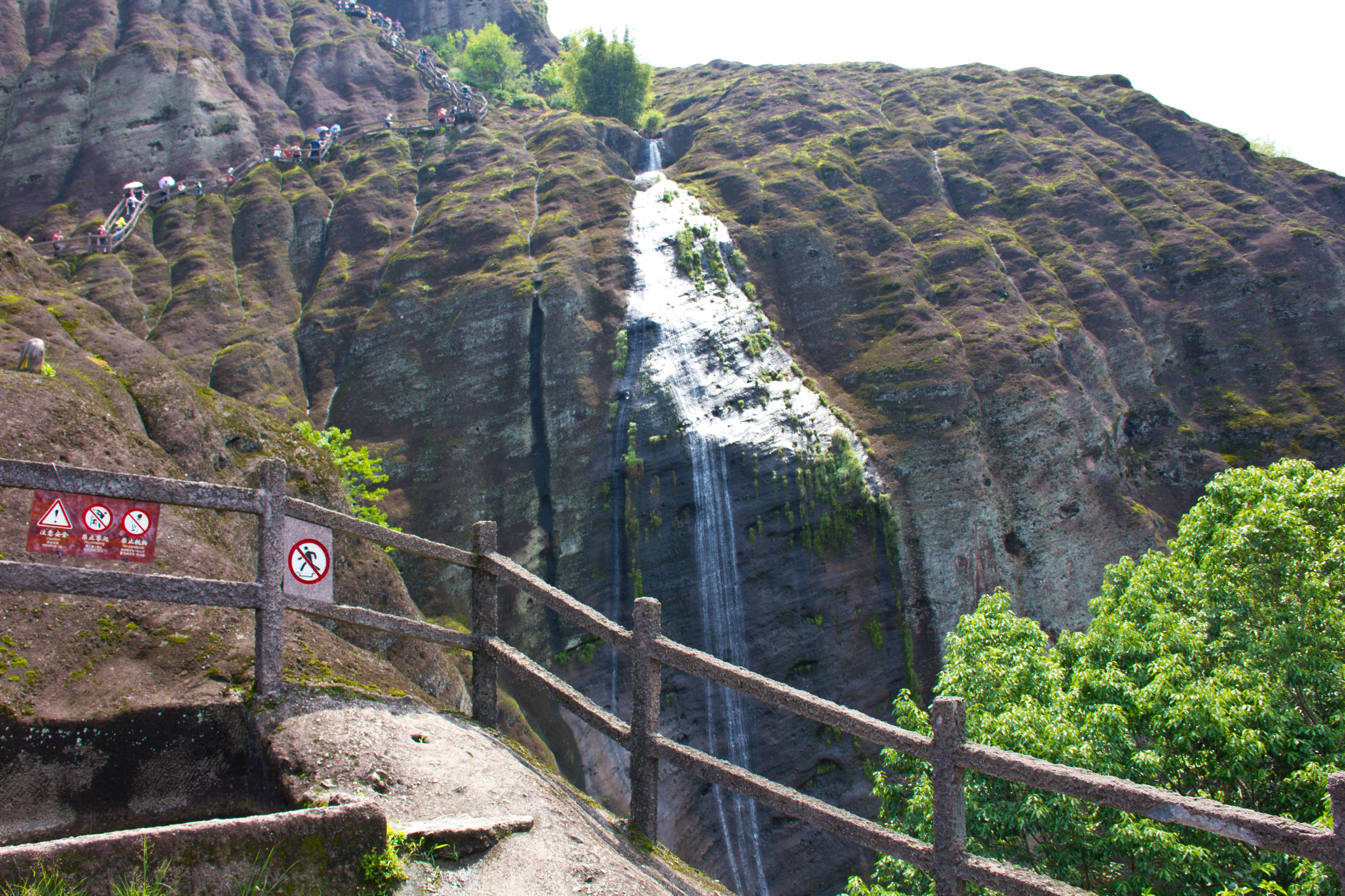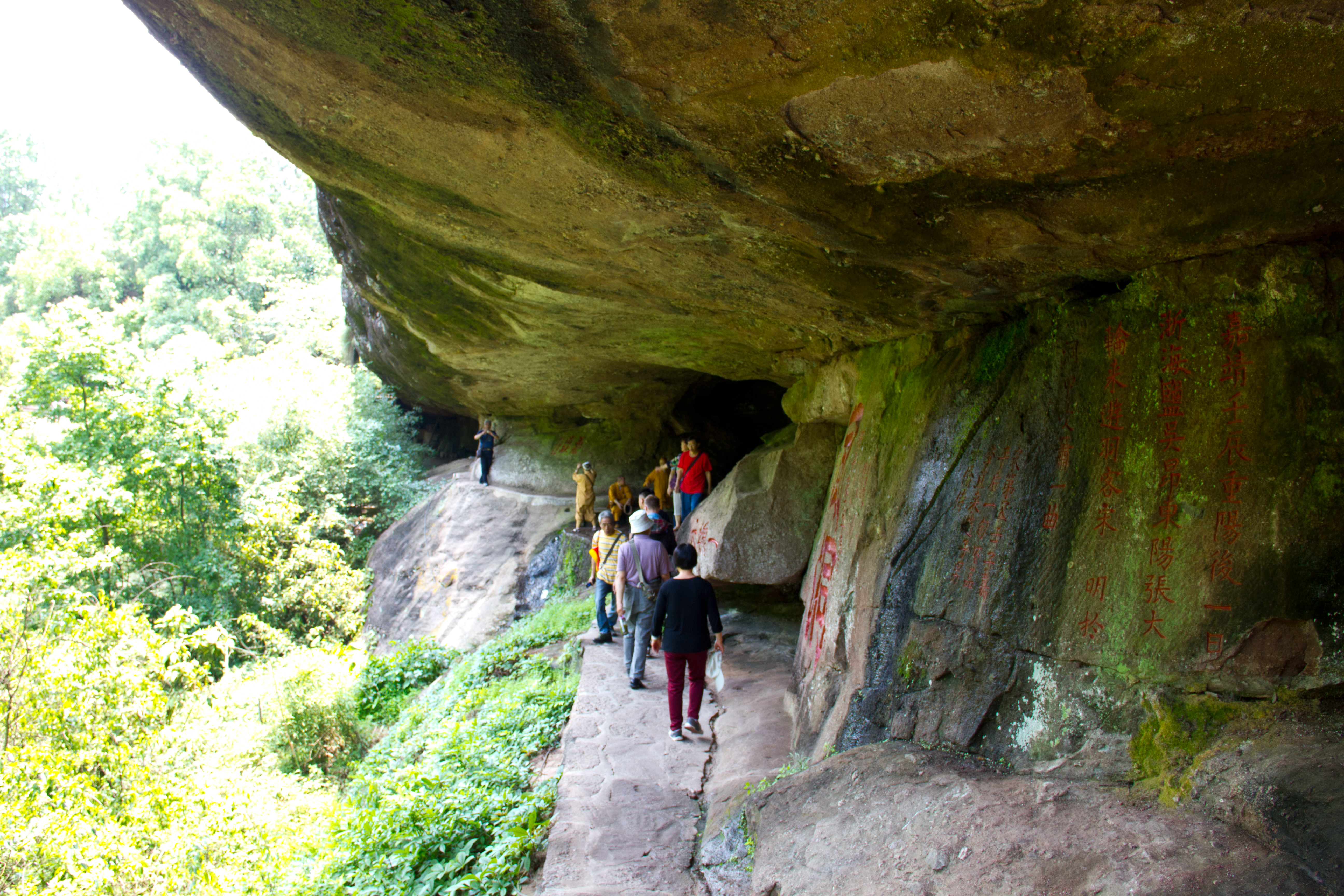 Shuilian Cave is one of the seventy-two famous caves in the area, but it is the largest cave in Wuyi Mountain. It is located on the north side of Zhangtang Stream. It is formed by the erosion of softer rock layers in horizontal rock formations and is squeezed out by running water. Therefore, unlike limestone caves, it is relatively spacious and can accommodate thousands of people. A spring gushes out from the ceiling of the cave, forming a waterfall about 80 meters high. Everyone admires the view of the waterfall as thousands of pearly drops rush down. The cave contains Sanxian Temple (Chinese: 三贤祠, pinyin Sānxián cí), San Jiaotang Church (Chinese: 三教堂, pinyin Sān jiàotáng) and Zhen Guan Temple (Chinese: 真观, pinyin zhēn guān), as well as many ancient inscriptions on rocks.