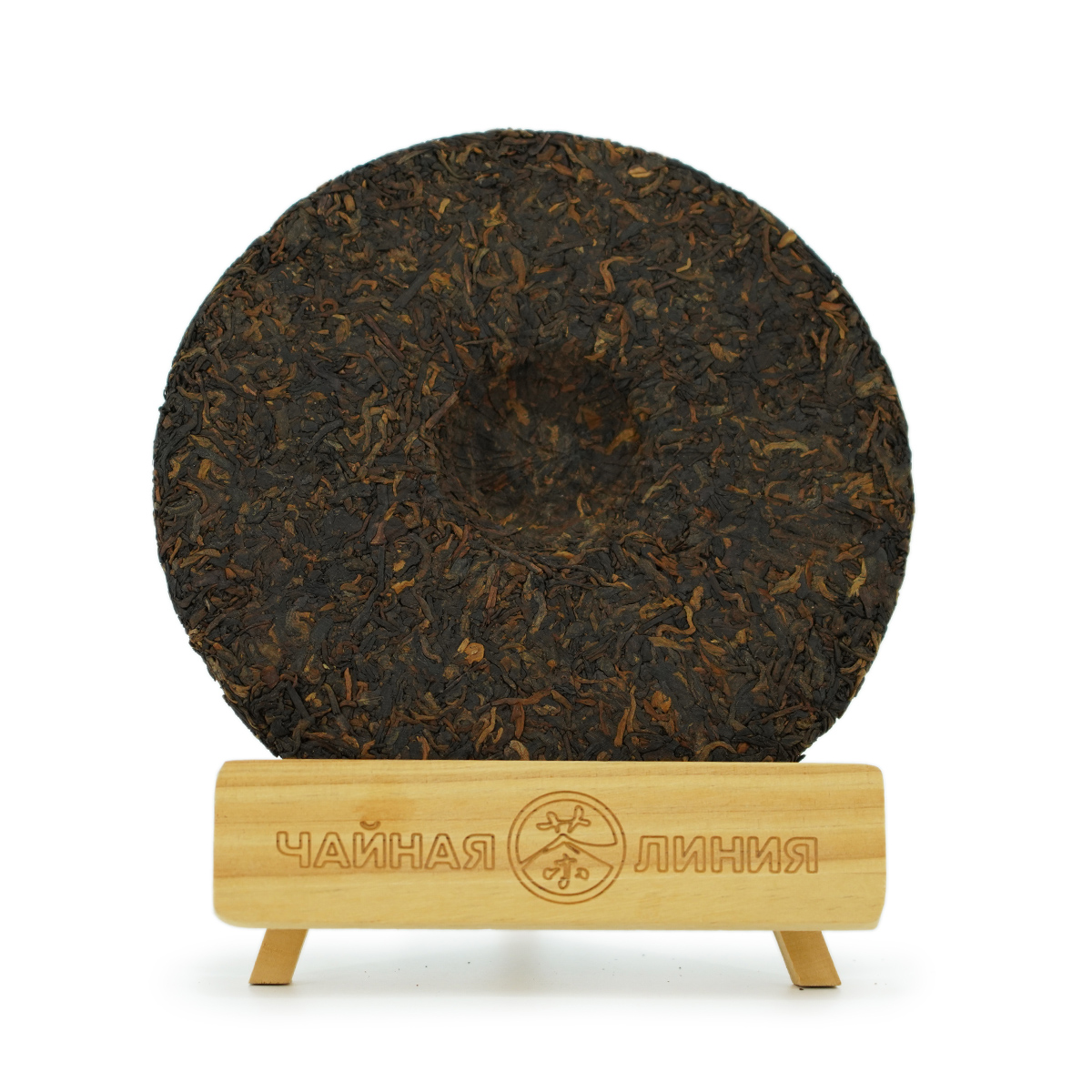 Классический 357-граммовый блин – удобная и традиционная форма для хранения и постепенного употребления пуэра. Поверхность блина выглядит привлекательно: смесь темно-коричневых и черных ферментированных листочков с заметным вкраплением золотисто-рыжих почек (Цзинь Я). Прессовка умеренная, позволяющая рассмотреть сырье.