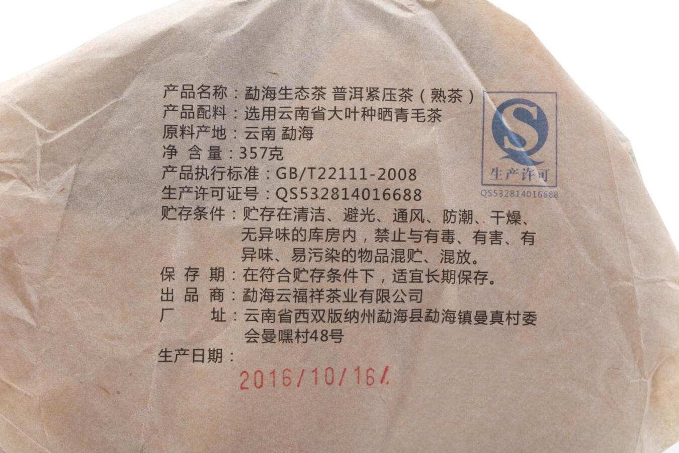 - Name:勐海生态茶 普洱紧压茶 (熟茶) – “Menghai ecological pu-erh, pressed (mature)”.