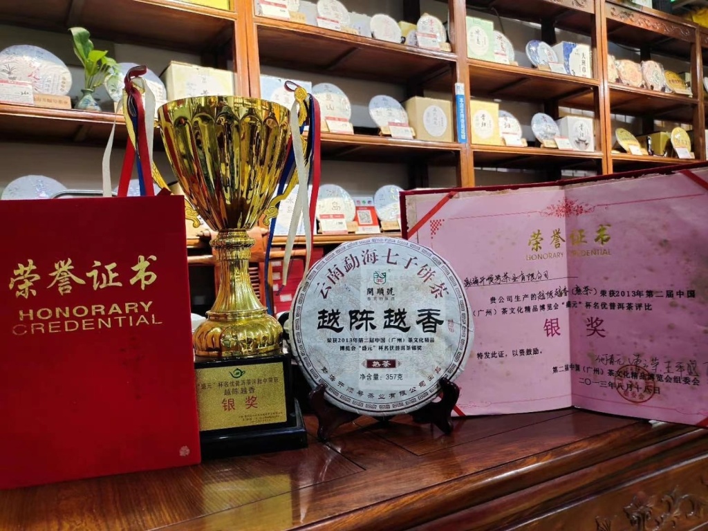At the second Guangzhou Tea Culture Expo in 2013, Kaishunhao's Shu Pu'er "The Older the More Fragrant" (Chinese: 越陈越香, pinyin: Yuè chényuèxiāng) and Shu Pu'er "Laoshu Jinya Gongcha" (Chinese: 老树金芽, pinyin: Lǎo shù jīn yá) received positive evaluations from the Yuannan Tea Association (云南省普洱茶协会), Guangdong Provincial Tea Circulation Association (广东省茶叶流通协会), Yunnan Provincial Tea Producers Committee (云南省茶产业办公室), Menghai County Government, Guazhou Shengyuan Zhanlan Company (广州盛元展览有限公司) and independent expert tasting. According to the overall assessment, they won an honorable silver medal at such a significant competition. This is a well-deserved award, because the tea is to the taste of all pu-erh lovers!